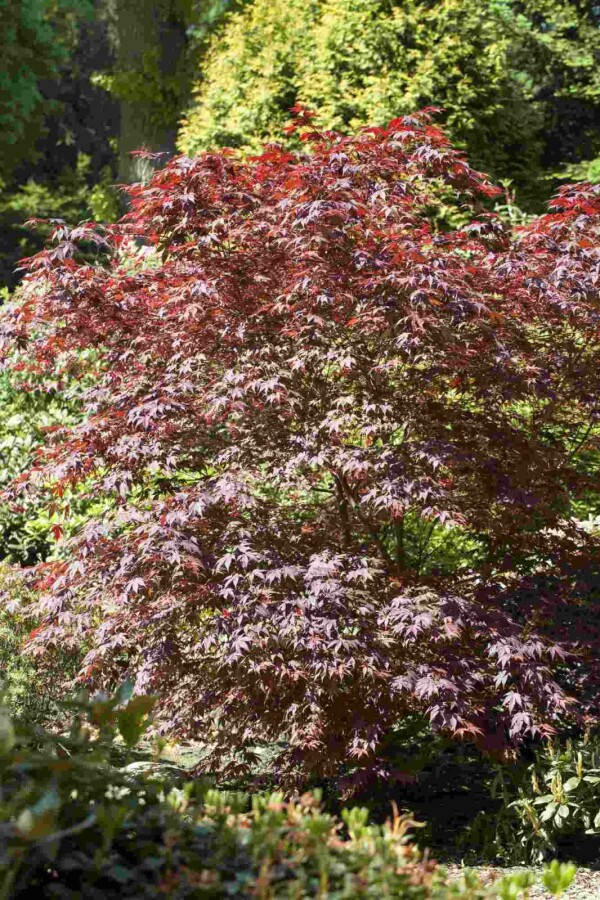 Plantes de jardin comme l'Acer palmatum 'Bloodgood' sont idéales pour les bordures grâce à leur port dressé et leur feuillage rouge foncé tout au long de la saison.