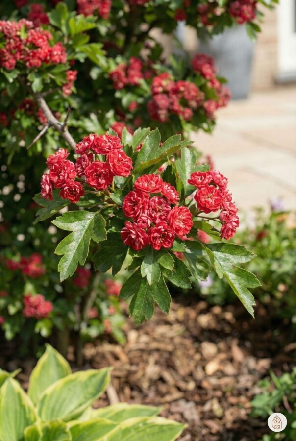 • Le Crataegus 'Paul's Scarlet' se distingue par ses fleurs doubles d'un rouge éclatant, qui apparaissent en abondance en mai et juin, apportant une note de couleur intense et une fragrance délicate.
