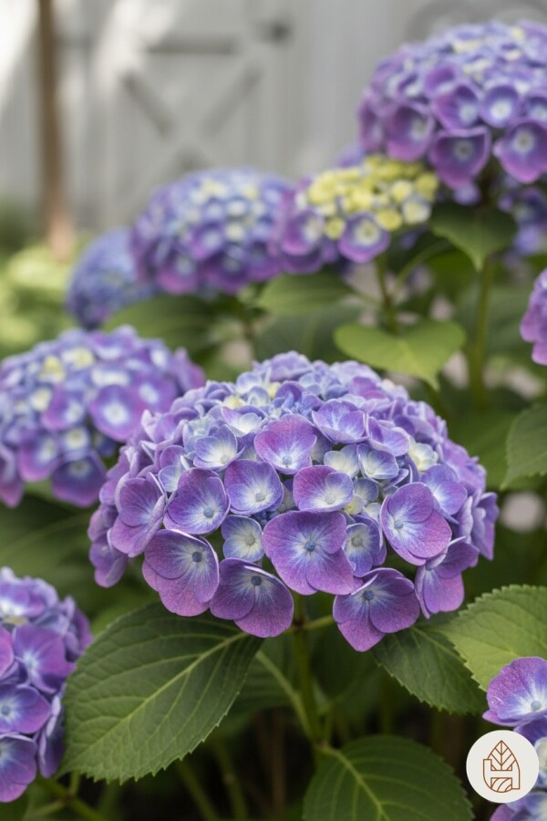 - La Hydrangea macrophylla 'Ayesha' fleurit de juillet à septembre avec des fleurs violettes en forme de cuillère, attirant les abeilles et les papillons.