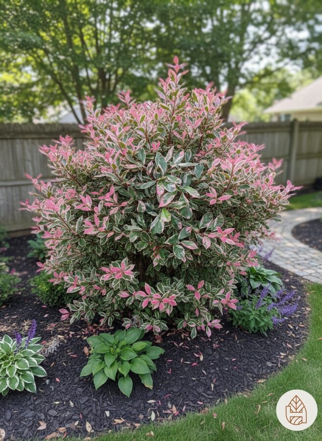 - Le Photinia fraseri 'Pink Marble' est idéal pour créer des haies colorées et denses, apportant une touche de couleur avec son feuillage vert et rose.