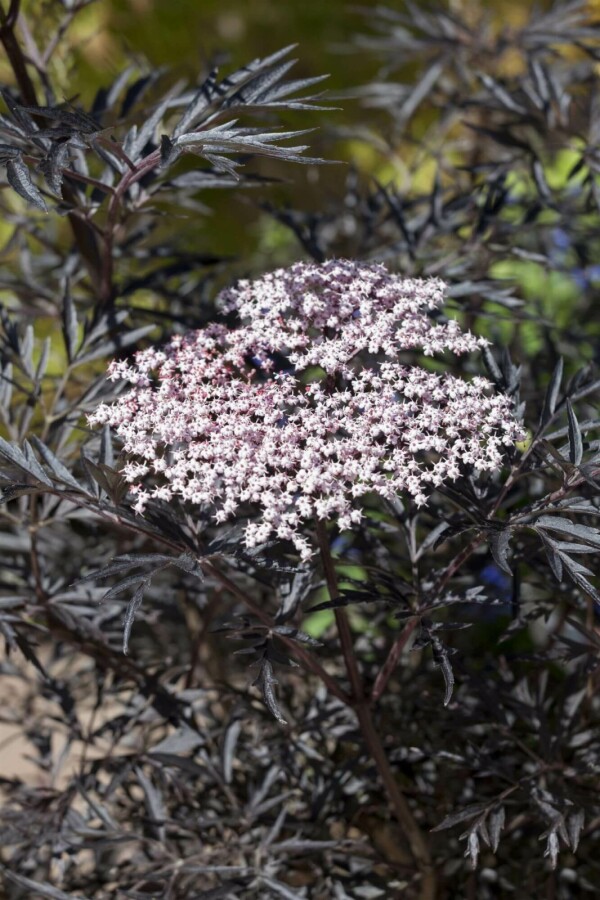 - La Sambucus nigra 'Black Lace' fleurit en mai et juin avec des fleurs roses et blanches.