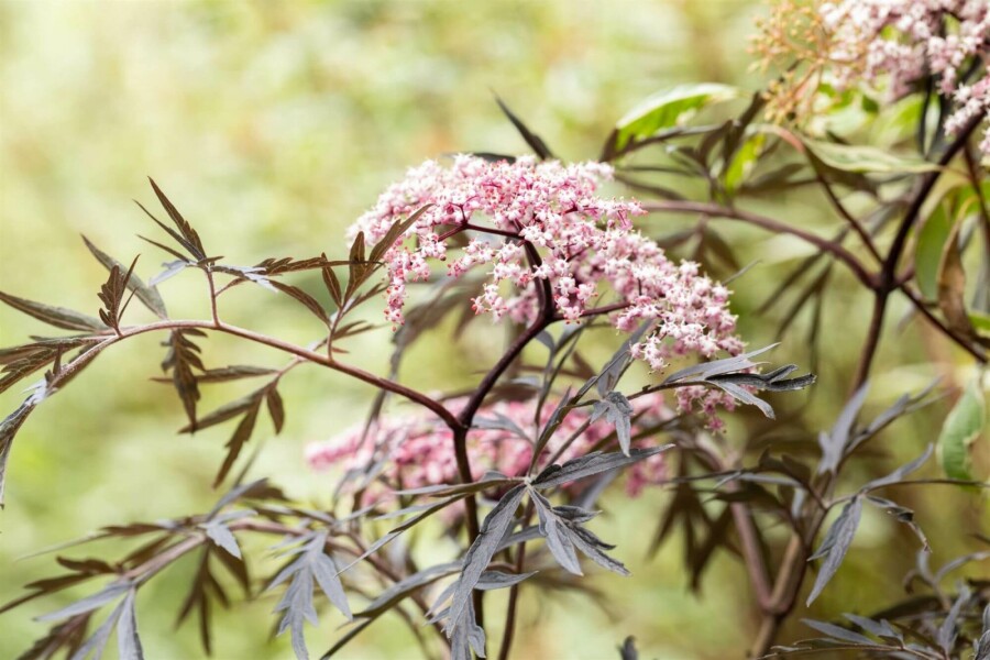 - La Sambucus nigra 'Black Lace' fleurit en mai et juin avec des fleurs roses et blanches.