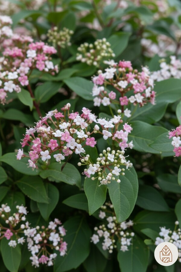 • La Viburnum tinus 'Lisa Rose' fleurit de l'automne au printemps, de octobre à avril, avec des fleurs blanches parfumées qui attirent les abeilles et autres pollinisateurs.